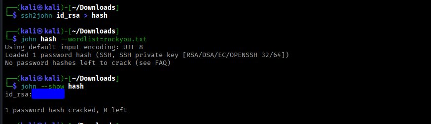 Once the key is safely on our machine, we need to extract the hash from it so John can understand it. We use ssh2john for this: