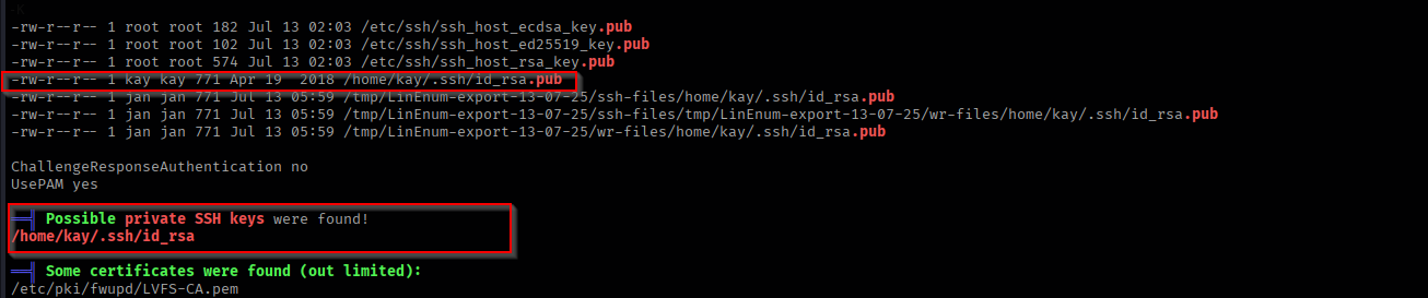 LinPEAS did not disappoint. In the report, we spotted a very interesting finding: a private SSH key (id_rsa) belonging to user K!